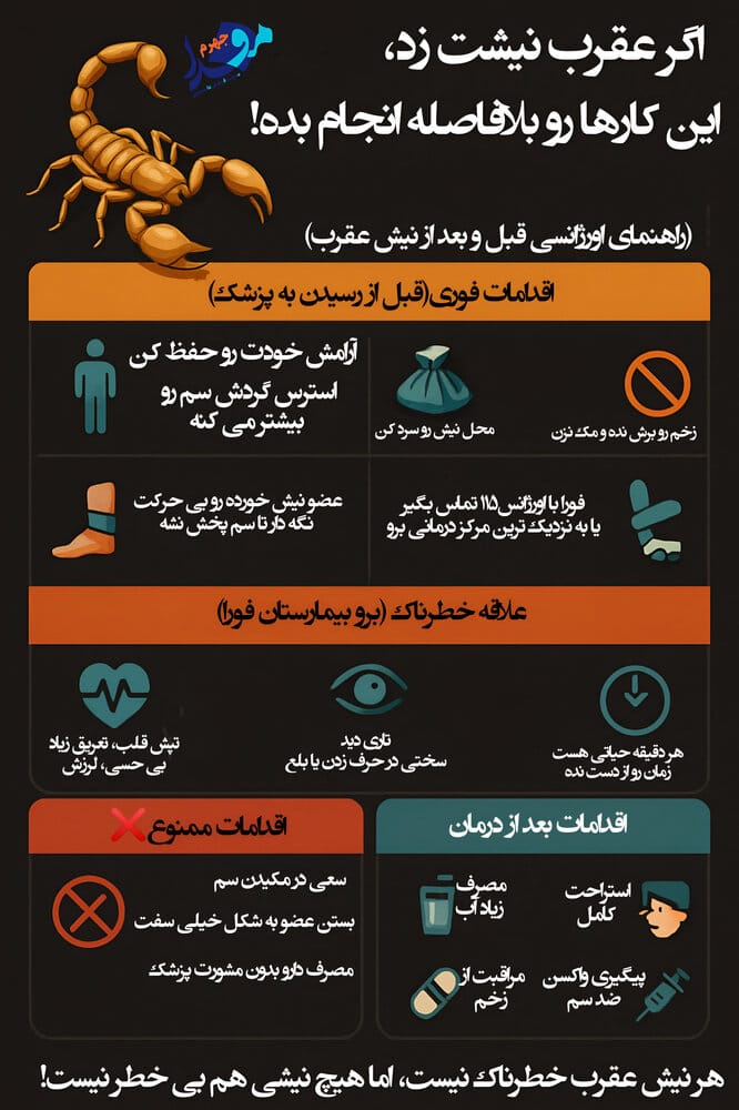 در صورت نیش عقرب، خونسردی خود را حفظ کنید و از هرگونه دستکاری زخم یا مکیدن محل نیش خودداری کنید. عضو آسیب‌دیده را بی‌حرکت نگه دارید و در اولین فرصت با اورژانس ۱۱۵ تماس بگیرید یا به نزدیک‌ترین مرکز درمانی بروید.